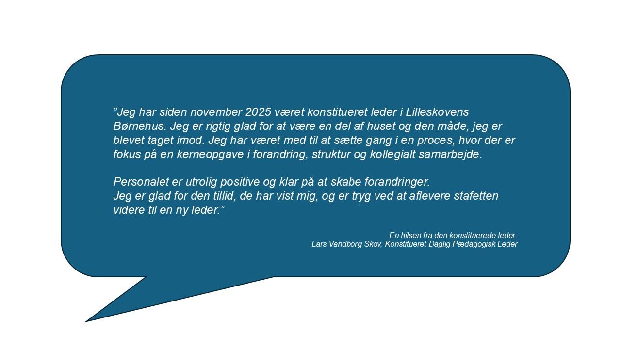 Derfor er der mulighed for at opslå følgende stilling.Lilleskovens Børnehus søger en pædagog på 37 timer eller mindre efter aftale, med start den 1. juni.2026Drømmer du om at arbejde, hvor naturen er en del af hverdagen, og hvor faglighed og fællesskab går hånd i hånd. Så er Lilleskovens børnehave helt sikkert noget for dig!